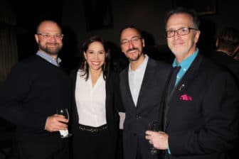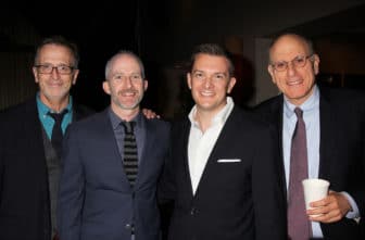 Tom Viola, executive director of Broadway Cares/Equity Fights AIDS with 2016 Recipients Thomas Mizer and Curtis Moore and Moore’s mother at the twelfth annual Fred Ebb Award for Musical Theatre Songwriting in the Penthouse Lounge at The American Airlines Theatre in New York City on November 28, 2016. Photo by Henry McGee