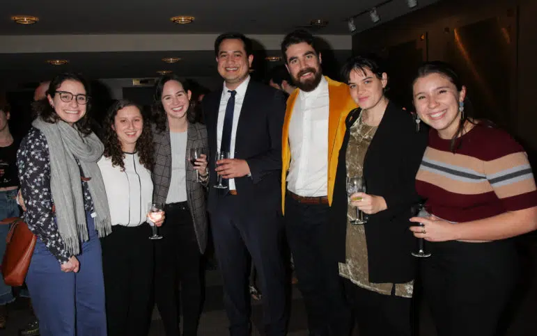 2019 Recipients Benjamin Velez and Angela Sclafani (center) with past winners Stacey Luftig, Curtis Moore, Thomas Mizer and Sam Willmott at the fifteenth annual Fred Ebb Award for Musical Theatre Songwriting honoring Angela Sclafani and Benjamin Velez in the Penthouse Lounge at The American Airlines Theatre in New York City on December 2, 2019. Photo by Henry McGee/Fred Ebb Foundation
