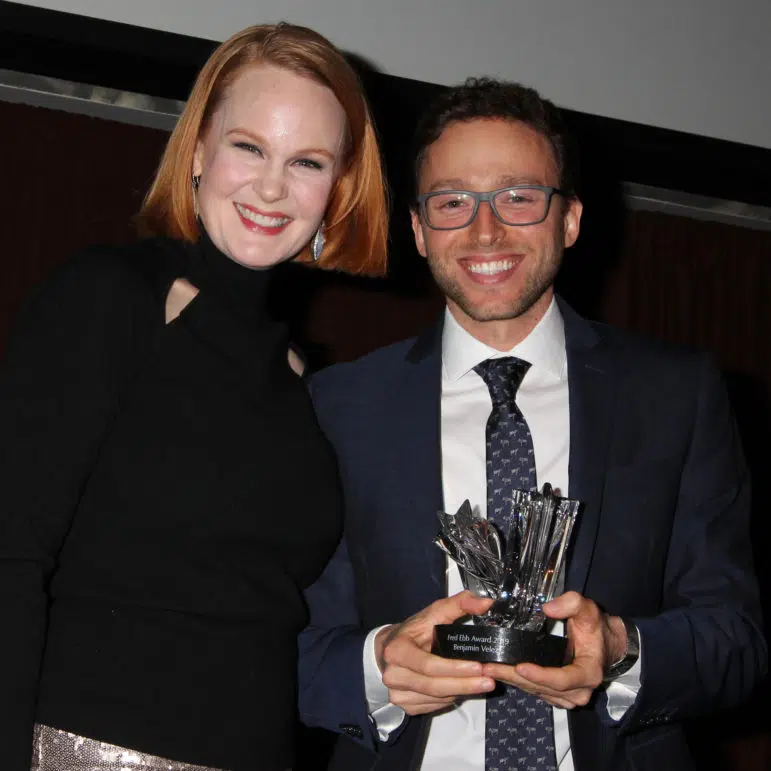 Kate Baldwin presents 2019 Fred Ebb Award to Benjamin Velez at the fifteenth annual Fred Ebb Award for Musical Theatre Songwriting honoring for Angela Sclafani and Benjamin Velez in the Penthouse Lounge at The American Airlines Theatre in New York City on December 2, 2019. Photo by Henry McGee/Fred Ebb Foundation