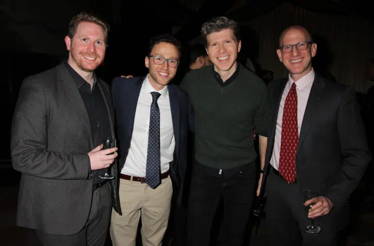 2019 Recipient Benjamin Velez with past winners Eric Price, Will Reynolds and Douglas J. Cohen at the fifteenth annual Fred Ebb Award for Musical Theatre Songwriting honoring Angela Sclafani and Benjamin Velez in the Penthouse Lounge at The American Airlines Theatre in New York City on December 2, 2019. Photo by Henry McGee/Fred Ebb Foundation